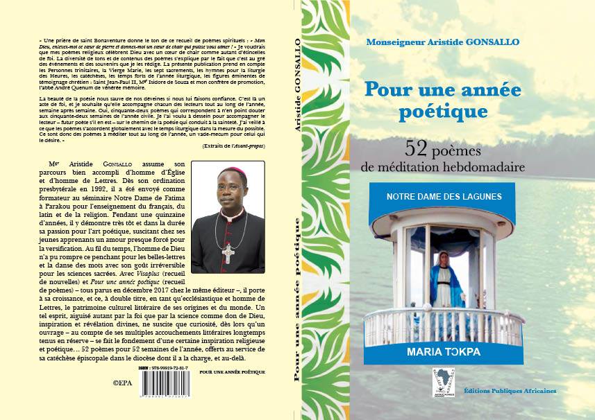 On le sait, la Poésie, c’est la Beauté, et la Beauté, c’est ce que nous avons vu et touché de nos doigts dans « Pour une année poétique », le premier recueil de poésies de Son Excellence Mgr Aristide GONSALLO, Evêque de Porto-Novo. L’œuvre est parue aux  Éditions Publiques Africaines en Décembre 2017.  A travers  « Pour une année poétique« , Aristide GONSALLO peint un monde tant spirituel que fraternel où l’amour de Dieu siège au cœur même de la raison humaine. Dans le livre, se côtoient amour du prochain, foi, charité, espérance et silence pour méditer chaque seconde sur les merveilles de Dieu.  Étant de sa fonction d’annoncer sans cesse cette divine parole du Christ « Aimez-vous les uns les autres » l’auteur  trouve à travers ce livre un moyen d’appeler à Dieu ses brebis égarées et qui au quotidien perdent l’Espérance. Ce livre doit intéresser tout lecteur soucieux de suivre les commandements de Dieu. Il s’agit en réalité d’un livre qui éclaire et réconforte ces jeunes qui aspirent à la vie sacerdotale. L’auteur dit en effet: « Que la vocation, c’est un appel à prier « page 74. »Pour une année poétique« , ce sont 52 poèmes de méditation correspondants aux 52 semaines de l’année. « Pour une année poétique« , c’est, in fine, un livre écrit avec soin et dans un style clair, enchanteur, un livre admirable où l’alexandrin trouve sa place bien respectée. Si dans son premier recueil de nouvelles « Visa Plus », l’homme a donné la pleine mesure de sa maîtrise de la narration, ici, c’est le spirituel qui s’exprime, l’orant qui fait de ses vers prière, méditation et adoration, le compagnon de route qui salue la mémoire de l’ami parti vers le Père, le dévot qui prie sa mère céleste, Marie. Voulez-vous passer une agréable année poétique, recueillie et priante, lisez ce joyau de Mgr Aristide GONSALLO! Voulez-vous que votre vie soit prière et que les vers vous élèvent vers Dieu, source de toute inspiration, faites vôtre ce chef-d’œuvre « Pour une année poétique » :